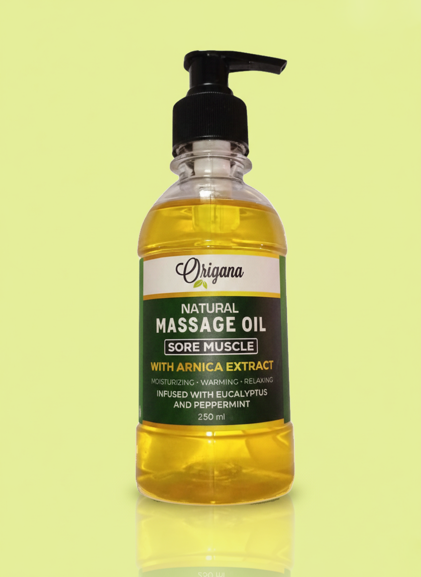 Experience relief from muscle tension with Origana Natural Massage Oil. Specially formulated with Arnica Extract, this oil is designed to soothe sore muscles and joints. Infused with the cooling and invigorating scents of Eucalyptus and Peppermint, it provides a warming sensation that promotes relaxation.